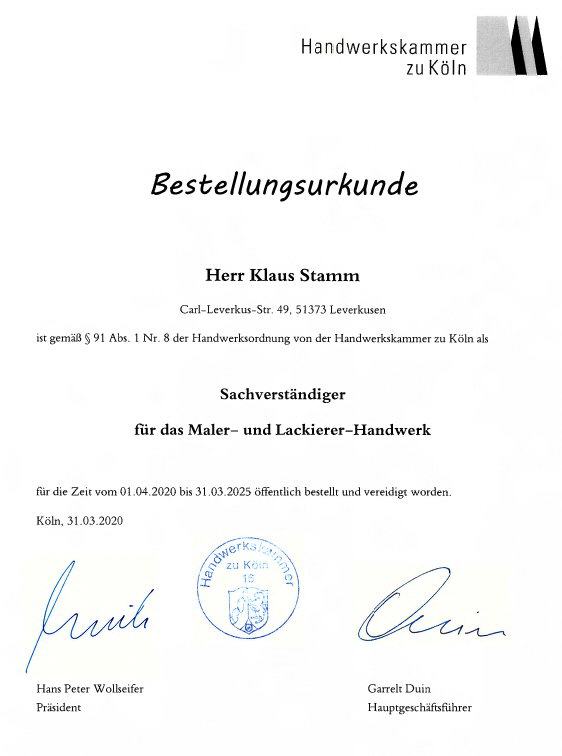 von der Handwerkskammer zu Köln 2006 öffentlich bestellt und vereidigt für das Maler- und Lackiererhandwerk. Seit mehr als 30 Jahren selbstständig als dritte Generation.